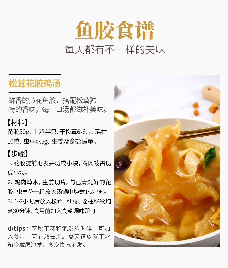 花膠即魚肚,是各類魚鰾的干制品,以富有膠質而著名,故名為花膠。花膠又名魚肚,是從魚腹中取出魚鰾,切開曬干后而成?;z含有豐富的蛋白質、膠質等,食療有滋陰養(yǎng)顏、固腎培精之效,可令人迅速消除疲勞。頂級魚肚排名依次是魚膠之王:金錢鳘魚膠、白花膠、黃鱘膠、黃花膠、鳘魚膠?;z不僅是筵席名菜,還有相當?shù)淖萄a價值。